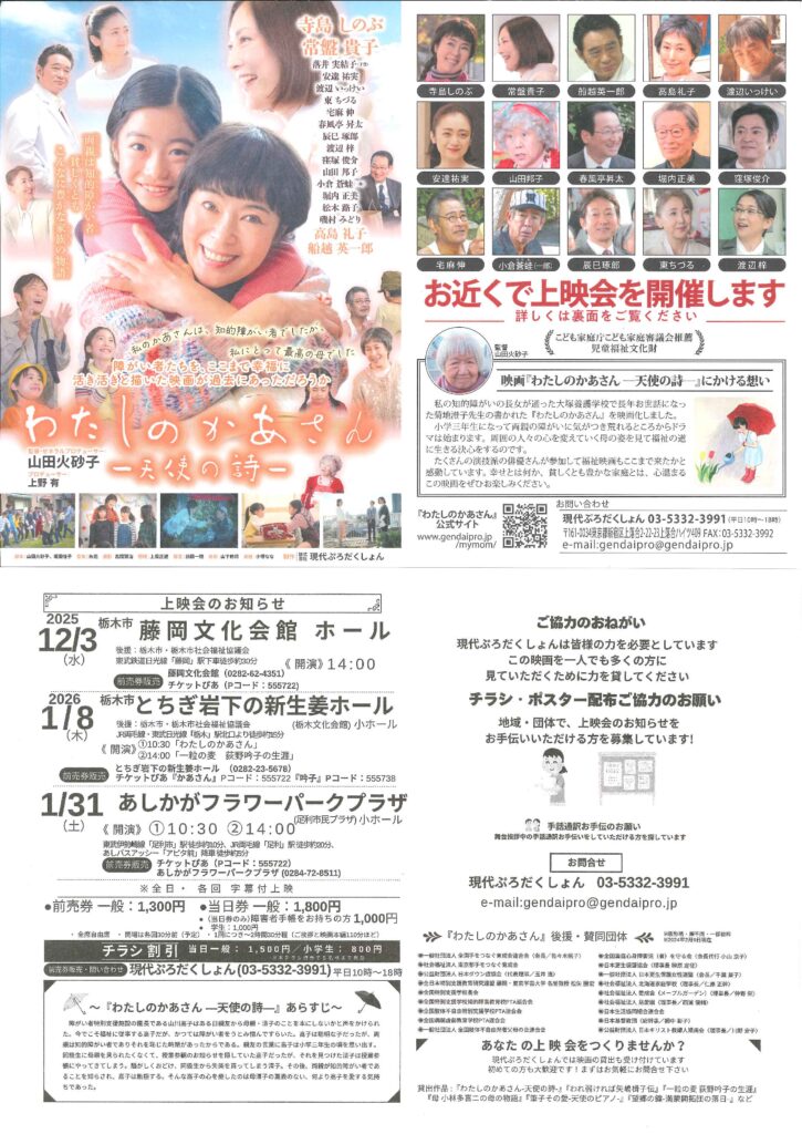 2025年11月20日 / 最終更新日時 : 2025年11月20日 事務局 お知らせ 「わたしのかあさん」上映会のお知らせ 標記上映会について、お知らせが届きました。詳細はこちらをクリックして、ご覧んください。 ダウンロード コメントを残す コメントをキャンセルメールアドレスが公開されることはありません。 ※ が付いている欄は必須項目ですコメント ※ 名前 ※ メール ※ サイト 次回のコメントで使用するためブラウザーに自分の名前、メールアドレス、サイトを保存する。 Δ このサイトはスパムを低減するために Akismet を使っています。コメントデータの処理方法の詳細はこちらをご覧ください。